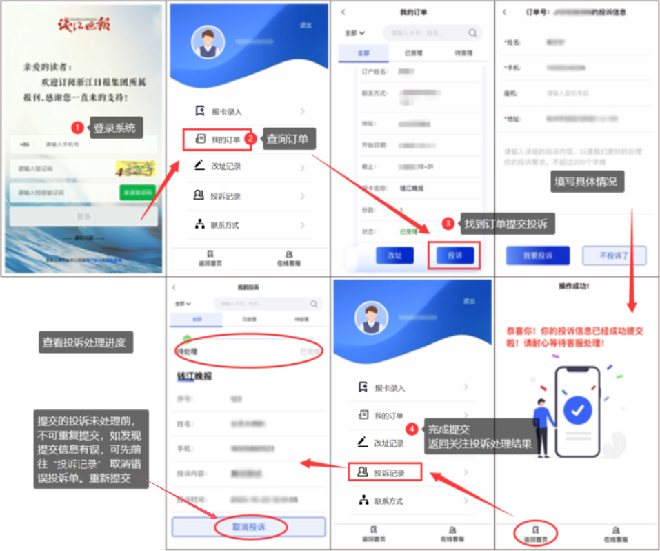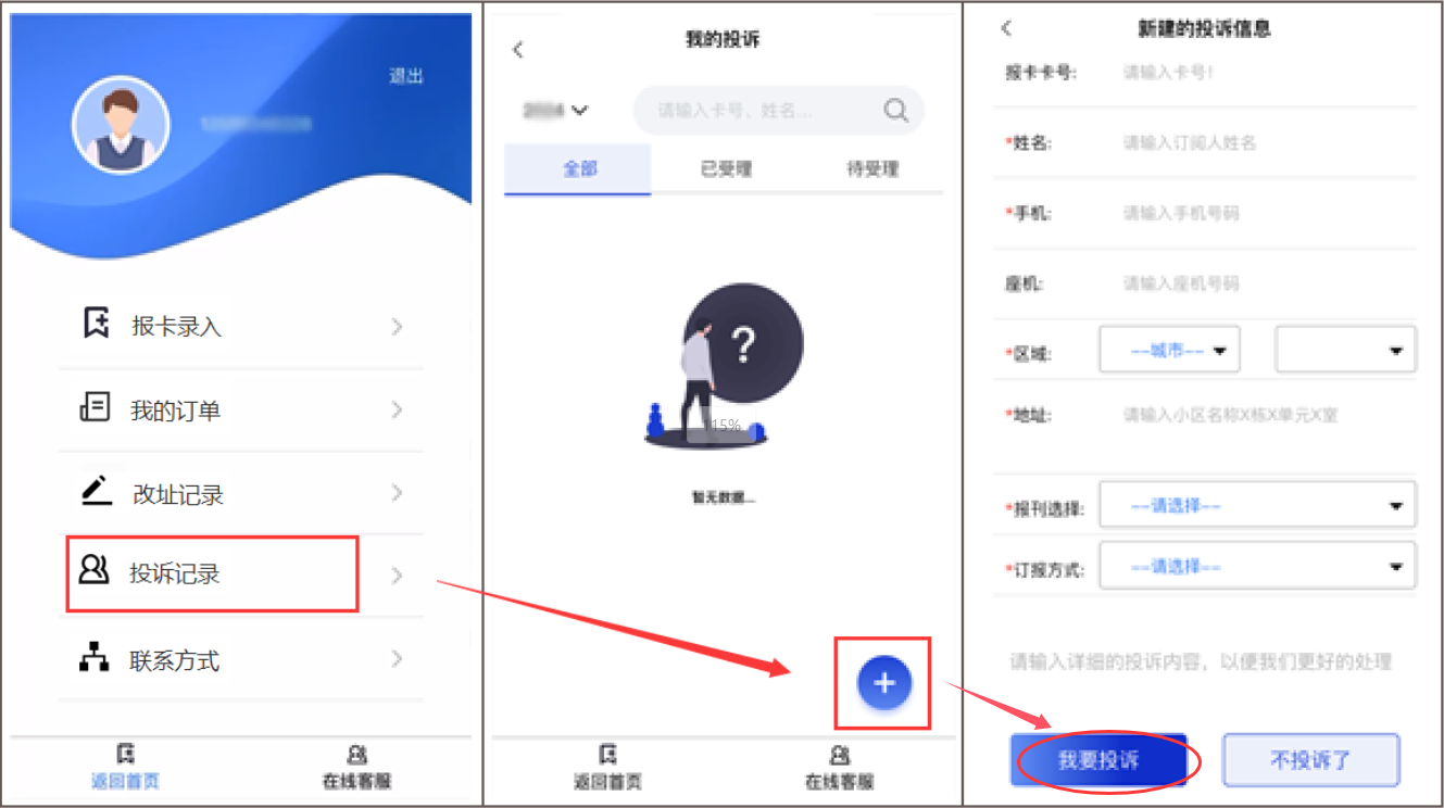 如“我的订单”内没有要投诉的订单,表示您目前登录的是非订报手机,请退出换订报手机重录,如订报手机已注销,请按以下方法提交。↓